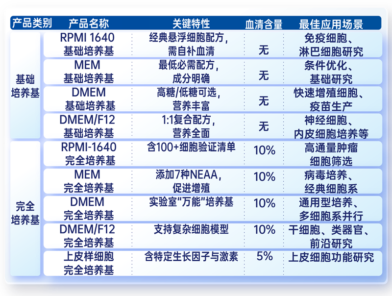 ⭐推荐:DMEM完全培养基(覆盖90+细胞系)+ RPMI-1640完全培养基(覆盖悬浮细胞)